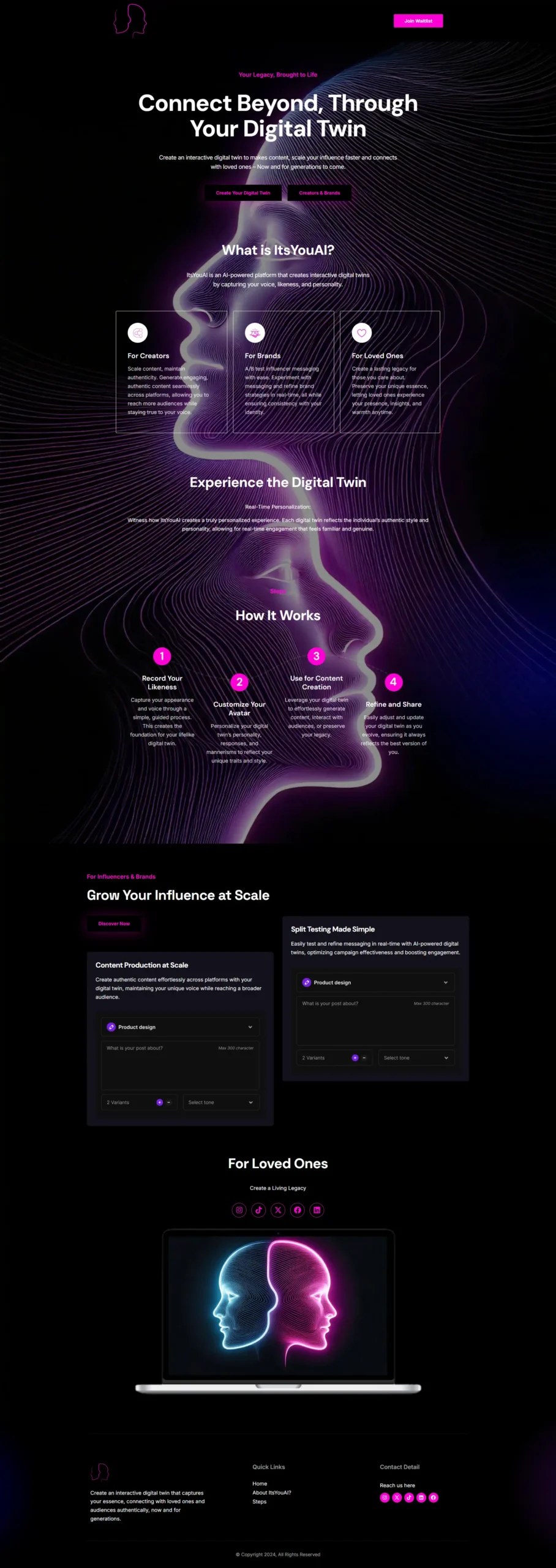This project showcases the design and development of the marketing website for ItsYouAI, an AI-powered platform that creates interactive digital twins for creators, brands, and loved ones.