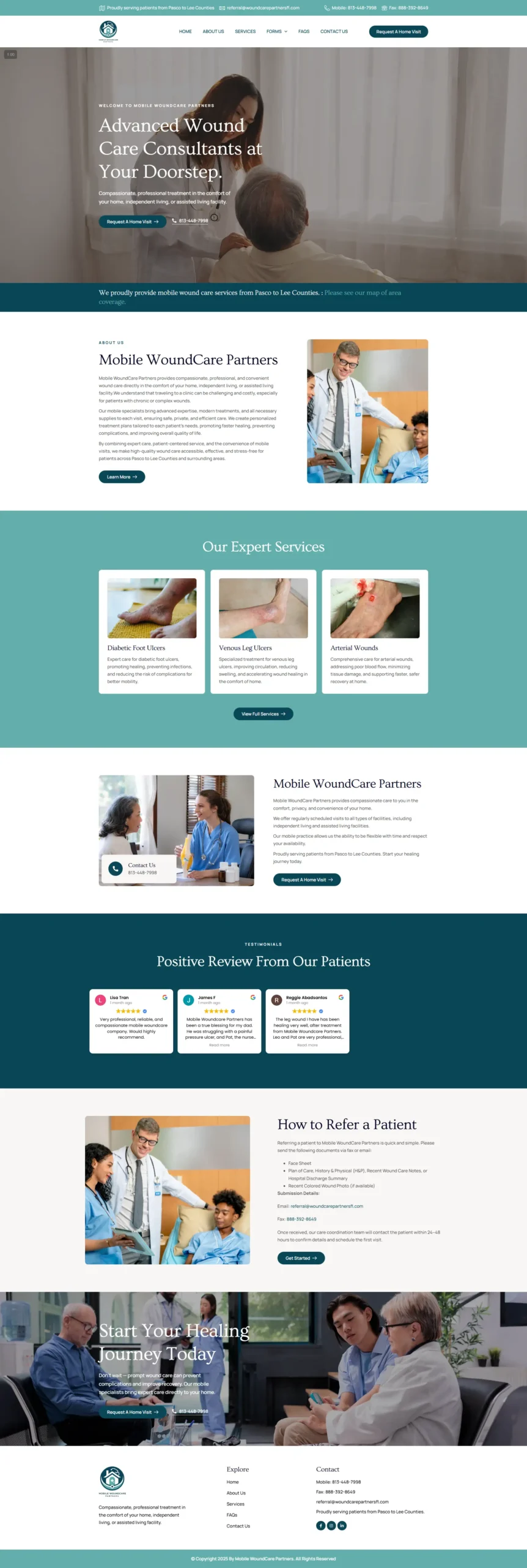 A professional healthcare website for Mobile WoundCare Partners, designed to clearly present mobile wound care services, streamline patient referrals, and make it easy for patients and providers to request in-home treatment across Pasco to Lee Counties.